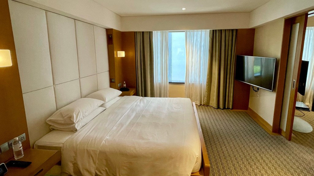 The room that was booked is king Bed Deluxe but one thing for sure, calling it a room is an understatement. It was more of a junior suite. What greeted us when opened the door was the living space; furnished with a work table, a sofa and a 42-inch flatscreen television. Very spacious, it’s ideal to entertain any more guests if you have. This time, I brought my siblings along! So the space is really enough for all of us.