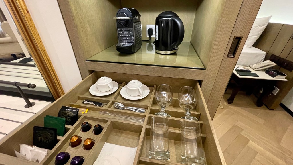 A complete set of mugs and glasses is available at the coffee and tea-making station. The teas are from TWG, and coffee pods are from Nespresso. Both brands, I really personally adore.
