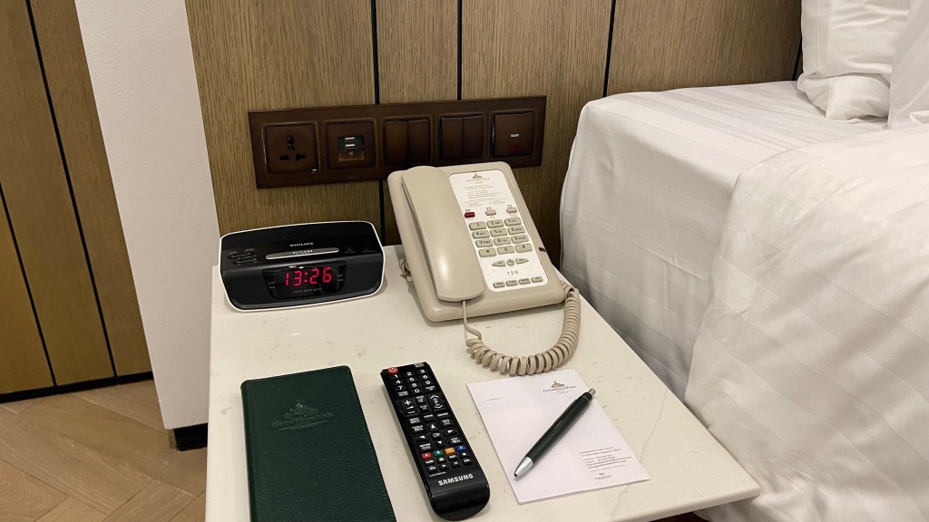 The left bedside table has an alarm clock and a telephone. There was a physical channel menu prepared too, really convenient for those who loves watching satellite channels cause I too find it annoying that you have to scroll the channels one by one just because the hotel doesn’t wanna provide a physical menu for you to choose from.