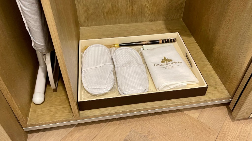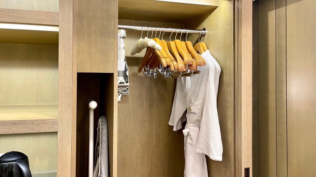 Room amenities like slippers, laundry bags and shoe horns are placed inside the wardrobe right by the coffee and tea station. An ironing board is also prepared for you.