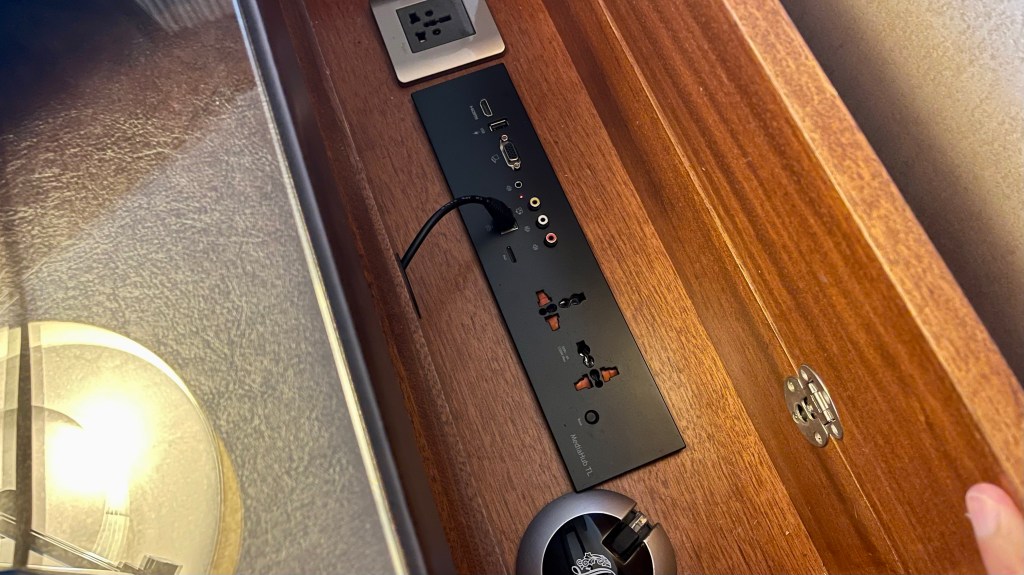 All the usual switches and plug sockets are available within the desk for your usage. However, we did try connecting our HDMI cables here but it didn’t link to our television.