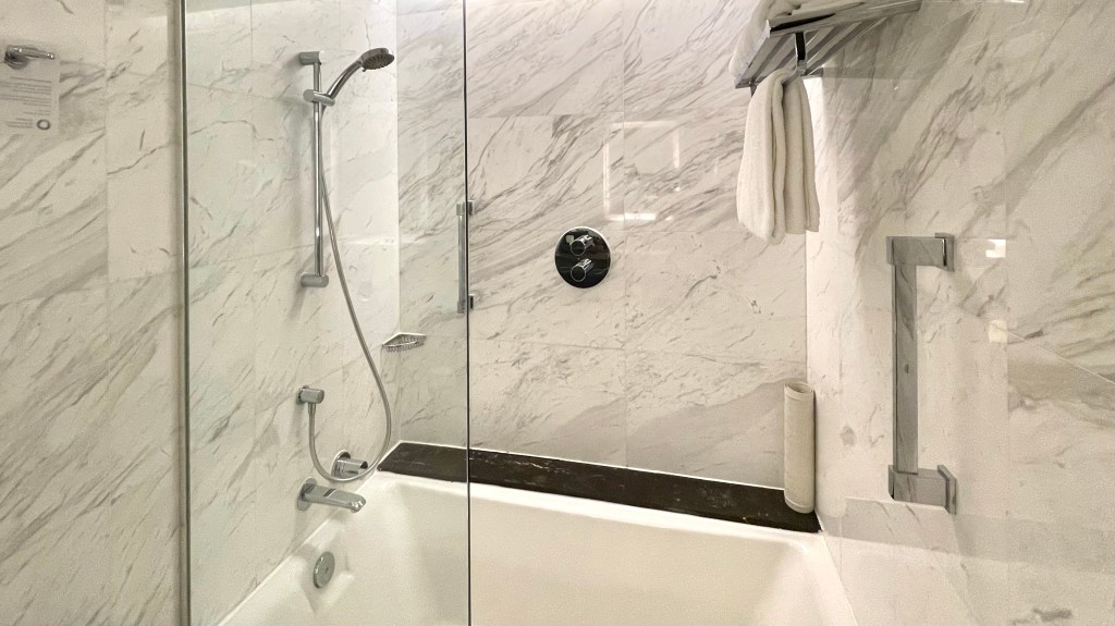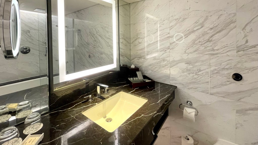 The vanity area was well-lit and elegant though. The bathroom is intricately designed with marble tiles from top to bottom, giving it a modern and luxurious look. It looks similar to Carlton Hotel’s vanity area too if you remember my stay there a few months back.