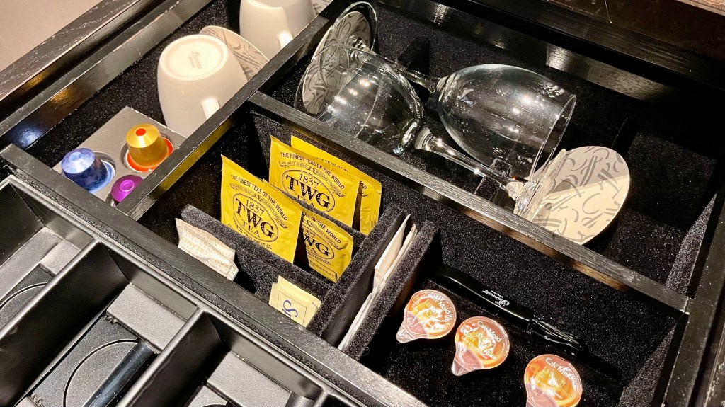 Wine glasses and mugs are available too in the drawer. Only 3 flavours of coffee pods are provided but if you need more, you can just call up the front desk. They’re really efficient, they pick up my calls within 30 seconds all the time.