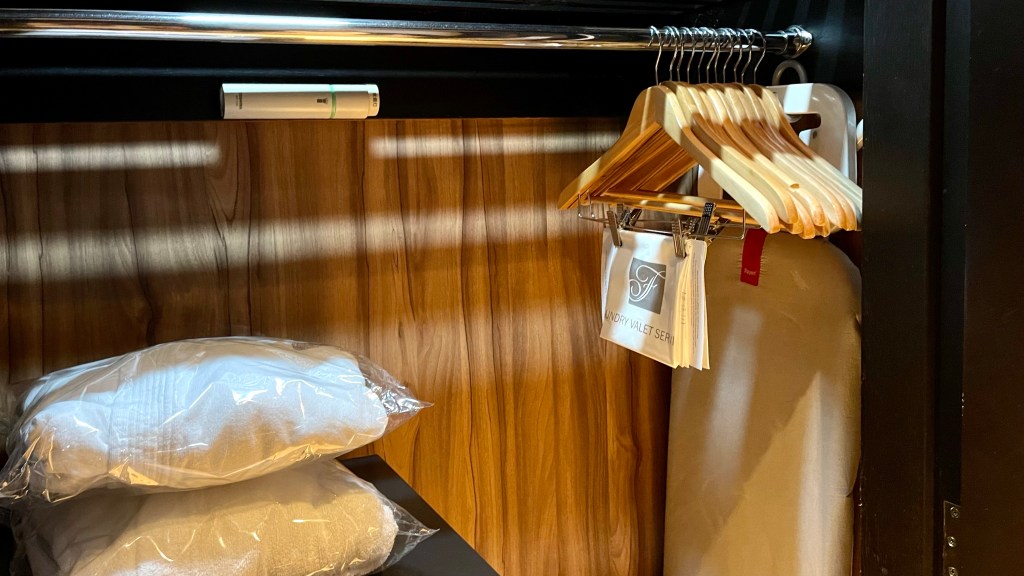 Right by the bathroom is the wardrobe, where all the every-day amenities are placed. Amenities include iron, ironing board, bathrobes, slippers and a hairdryer.