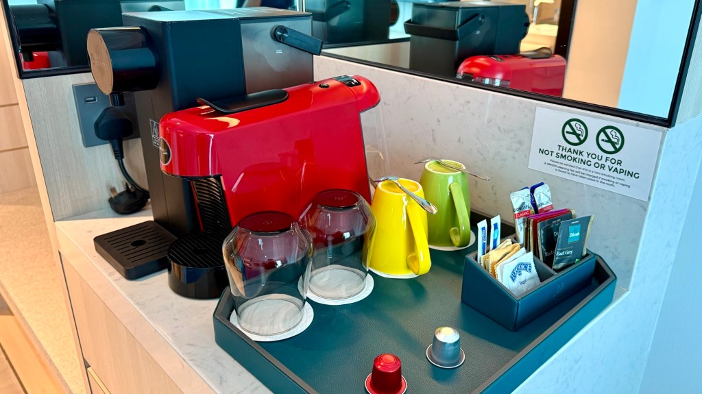 The suite comes with a coffee machine with only two coffee capsules. No bottles water are placed in the room but there’s a water filtering machine provided, where you can pour tap water in and it will filter and dispense clean drinking water for you. I personally prefer bottled waters but save the earth I guess?