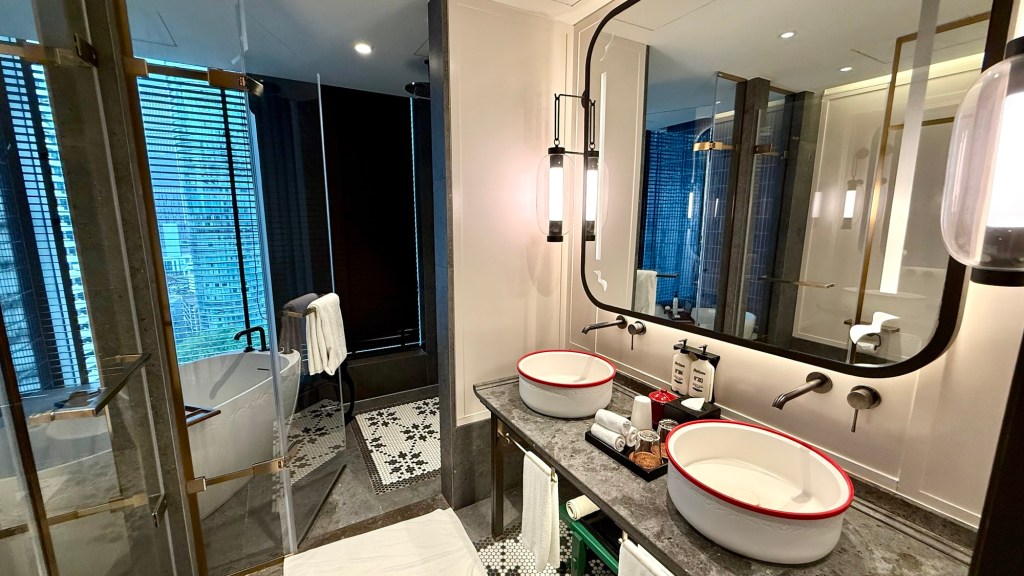 The bathroom deserves its own moment. A freestanding bathtub right by the window and a rain shower overlooking the city of Kuala Lumpur.