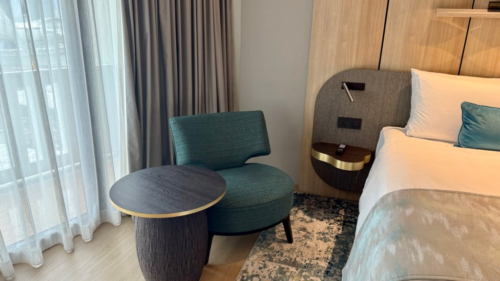 Across from the bed is a little seating area with an armchair and a side table. I always wonder why this area always exists in hotel rooms. Do guests really sit on that armchair, and I don’t know? Read a book, drink coffee? I guess it’s perfect for doomscrolling Tiktok! Have you guys seen that video of the Director of FBI being interrogated at the senate hearing? His eyes are so weird.